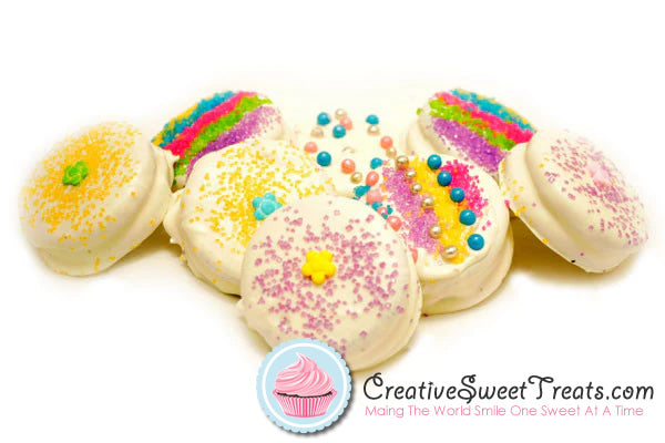 Have our unique, hand made Easter Chocolate Dipped Oreos Delivered or shipped to your home, business or event location. Each one of these Double Stuf Oreos are hand dipped into your choice of base chocolate, which typically white chocolate is used for Easter but you can also choose milk, dark or mint chocolate. We then decorate the top of each one differently using a variety of candies and colored sugar. Unlike other mail order treats these are made only after you order them, this is to ensure the best tasting product possible.